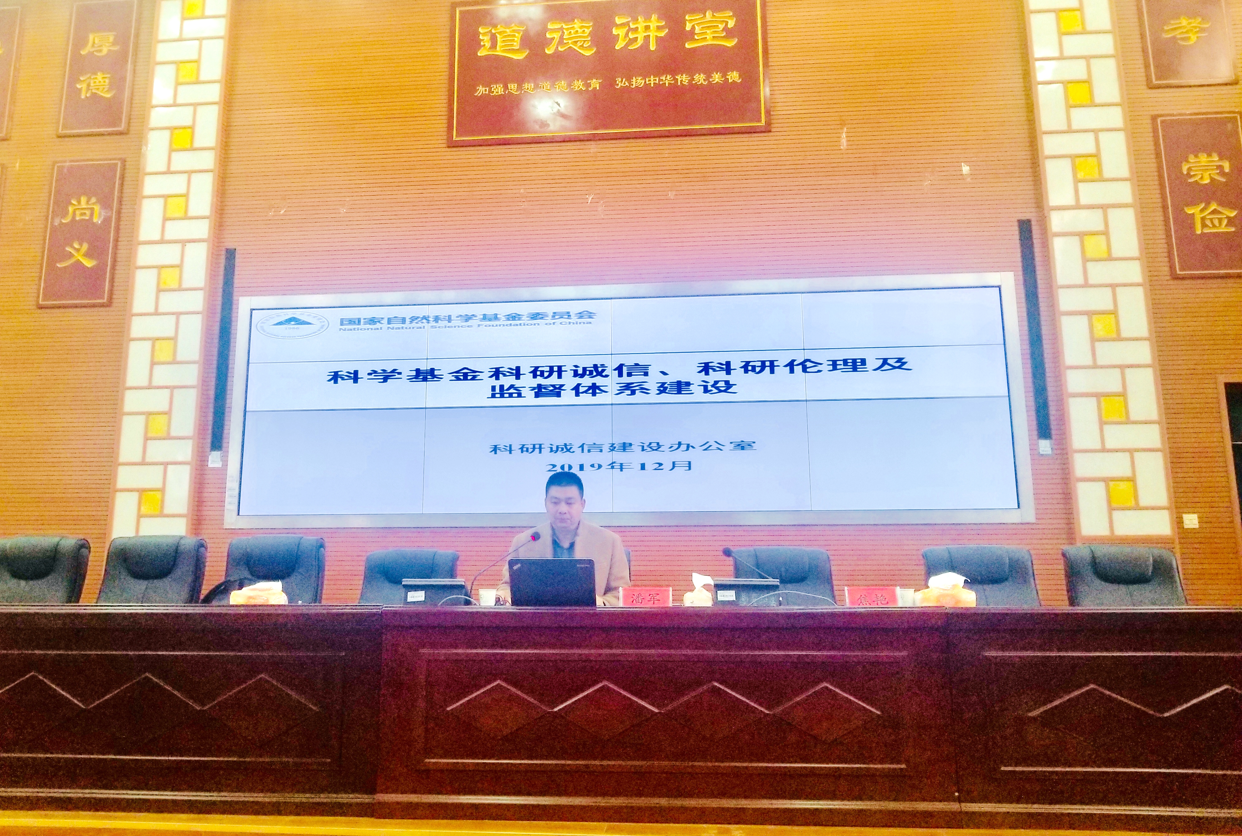 2019年12月30日下午,贵阳学院在第三教学楼4楼报告厅(道德讲堂)举办科研诚信工作专题讲座,国家自然科学基金委科研诚信建设办公室潘军主任受科技处邀请主讲。贵阳学院副校长焦艳主持讲座,并代表贵阳学院对潘军主任的莅临指导表示热烈的欢迎。科技处、教师工作处、研究生处、人事处、审计处等相关部门负责人,全校地厅级以上在研科研项目负责人、近三年内入职的硕士博士老师、各教学院(部门)科研秘书及联络员参加讲座。