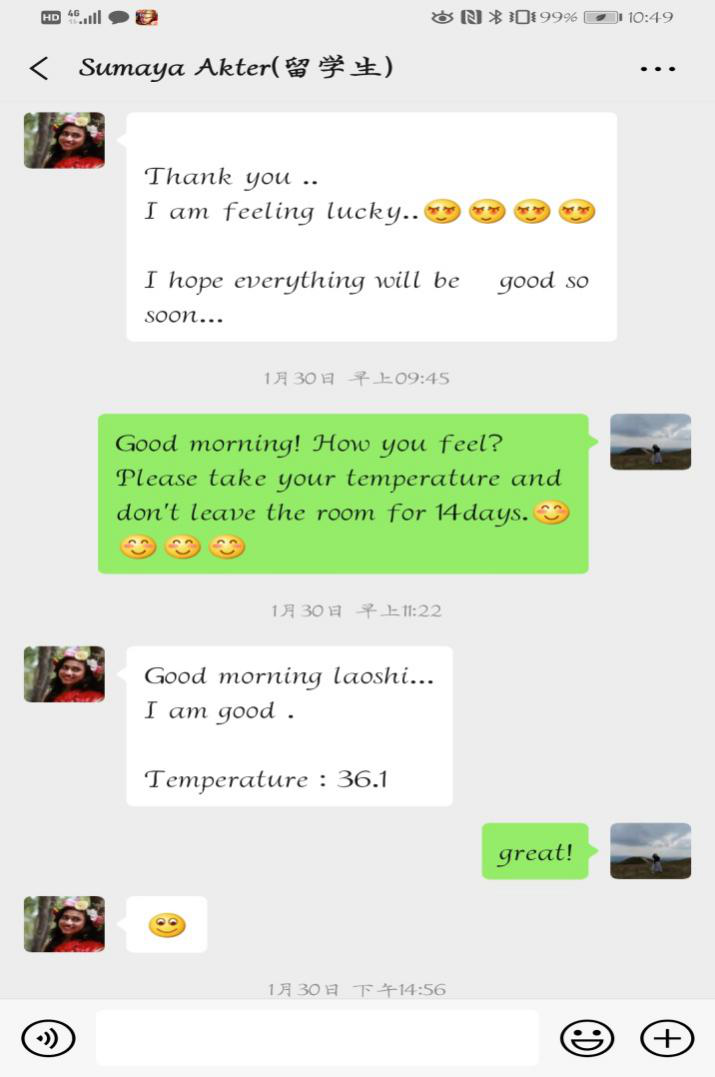 2020年1月29日,在山东济南的孟加拉籍留学生在经过与学校沟通后返回学校,虽不是从疫区返回,但我校仍采取了隔离措施,单独的房间,有空调、冰箱、热水器等设施,准备了体温计,以及相应的生活物资和用品,保障隔离期间的生活,每日汇报体温,观察身体状况,近几日体温测量(附图片)正常。同时嘱咐其他同学和宿管人员与其隔离。