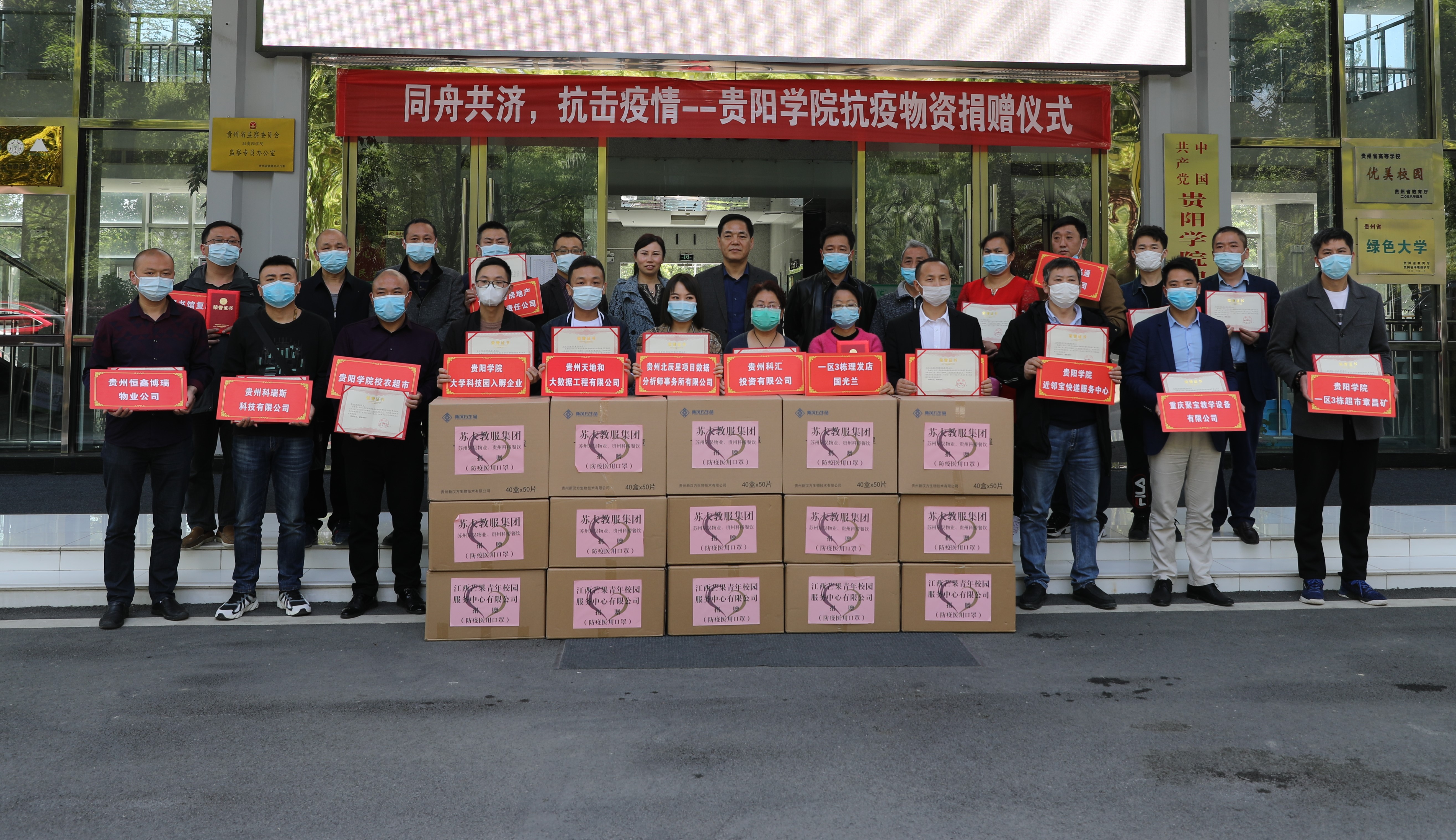 4月29日,爱心企业和爱心人士向我校捐赠抗疫物资仪式在贵阳学院九思楼前举行。副校长韩勇代表学校接受捐赠,并向捐赠代表们颁发证书。党委宣传部部长杨方旭、后勤处杨卫兵、崔寅生副处长以及27家爱心企业和爱心人士代表出席捐赠仪式。