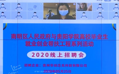 随后,贵阳学院招生与就业处时军处长介绍了学校2020届毕业生就业基本情况,并与南明区人力资源和社会保障局签订《贵阳市南明区人力资源和社会保障局与贵阳学院联合开展高校毕业生就业创业帮扶协议书》。中智国际人才资源服务有限公司和贵州华创芯光科技有限公司代表分别就公司简况和企业用人需求做了发言,贵州华创芯光科技有限公司与同学代表进行在线供需见面洽谈,部分企业与同学现场签约。