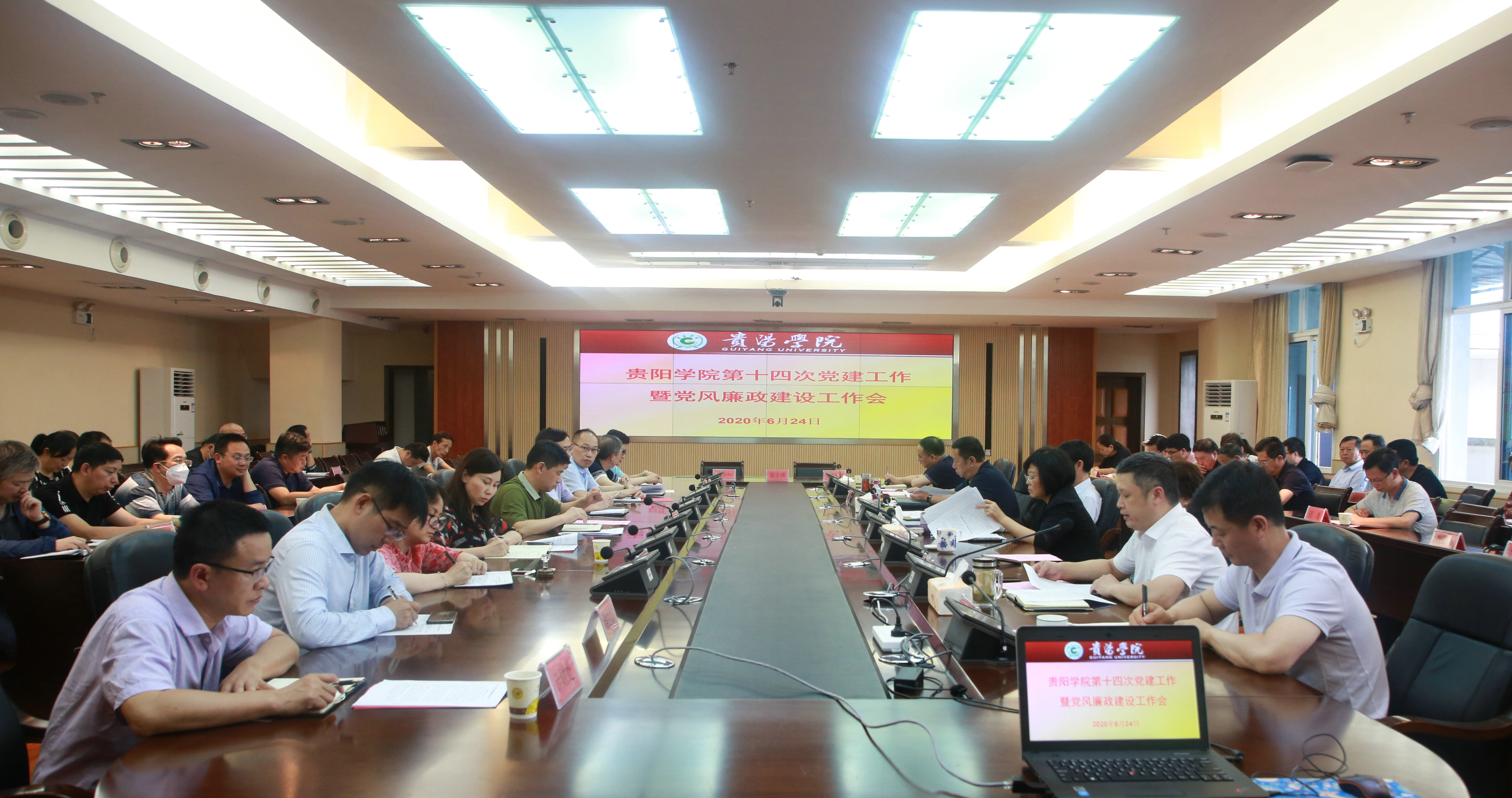 2020年6月24日,贵阳学院召开2020年党建工作暨党风廉政建设工作会议,深入贯彻落实习近平新时代中国特色社会主义思想、全国全省教育大会、思想政治工作会议、党的十九届四中全会、省委十二届六次全会和市委全会精神;认真学习贯彻十九届中纪委三次全会、十二届省纪委三次全会及十届市纪委四次全会精神。总结去年我校党建工作暨党风廉政建设工作,安排部署今年的工作,推进我校全面从严治党向纵深发展。校党委书记吕保平出席并作重要讲话,党委副书记杨青、党委副书记张年举、副校长焦艳、副校长韩勇、纪委书记马力、副校长赵福菓、副校长刘刚出席会议,各部门负责人、教学院党政负责人参加会议。会议由党委副书记张年举主持。