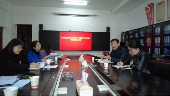 其次,刘刚副校长听取了院长陈雨青和教研室负责人对于专业建设、本科教学和科研工作的汇报。在充分肯定了学院为今年申报电子信息专业硕士点的工作而做出的努力的同时,就如何提升学院科研实力提出了具体要求。学院要结合现有资源,转变思路,注重顶层设计,主动对接国家、省、市电子信息产业技术需求,加强学科建设,打造有特色的高层次科技创新平台;及时做好科研的成果提炼和转化工作,更好体现学院服务地方经济建设的成效和提高学院的社会影响力。