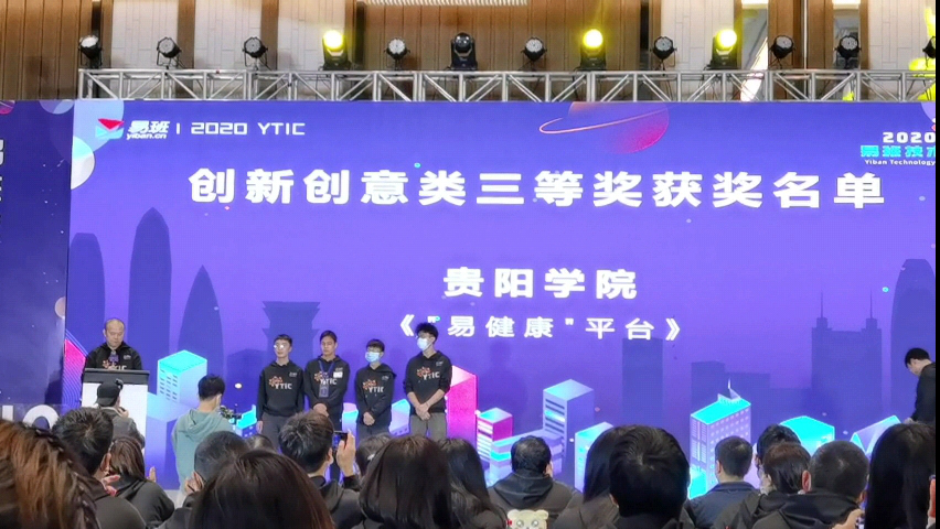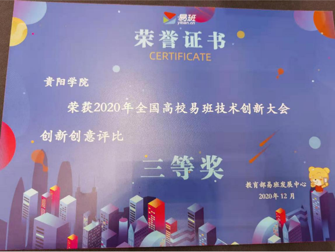 贵阳学院易班指导老师杨媛带领易班学生工作站团队5人(杨瑞宇,程欣,汪雪莹,王璐璐,韩良俊)设计了“易健康”平台代表贵阳学院参加此次比赛,比赛作品分技术创新类和创新创意类两大类别,我校“易健康”平台作品获创新创意类三等奖。