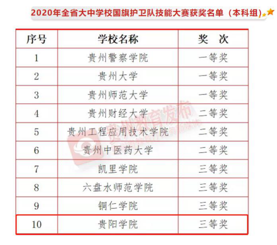 11月中下旬,省教育厅组织了以“不忘初心跟党走、不负韶华护国旗”为主题的全省首届大中学校国旗护卫队技能大赛,全省150余所学校参加比赛并提交视频资料,经专家组评审,47个单位获奖。我校国旗护卫队钱师琪等21名队员参加,荣获三等奖(本科组)。