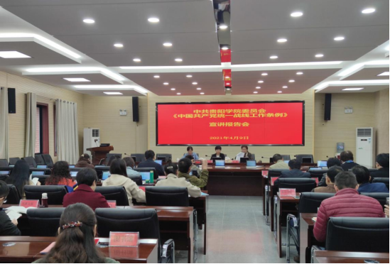 2021年4月9日,贵阳学院召开学习习近平总书记关于加强和改进统一战线工作的重要思想,学习贯彻《中国共产党统一战线工作条例》宣讲报告会。市委统战部常务副部长向洋作宣讲报告,贵阳学院党委副书记焦艳主持。