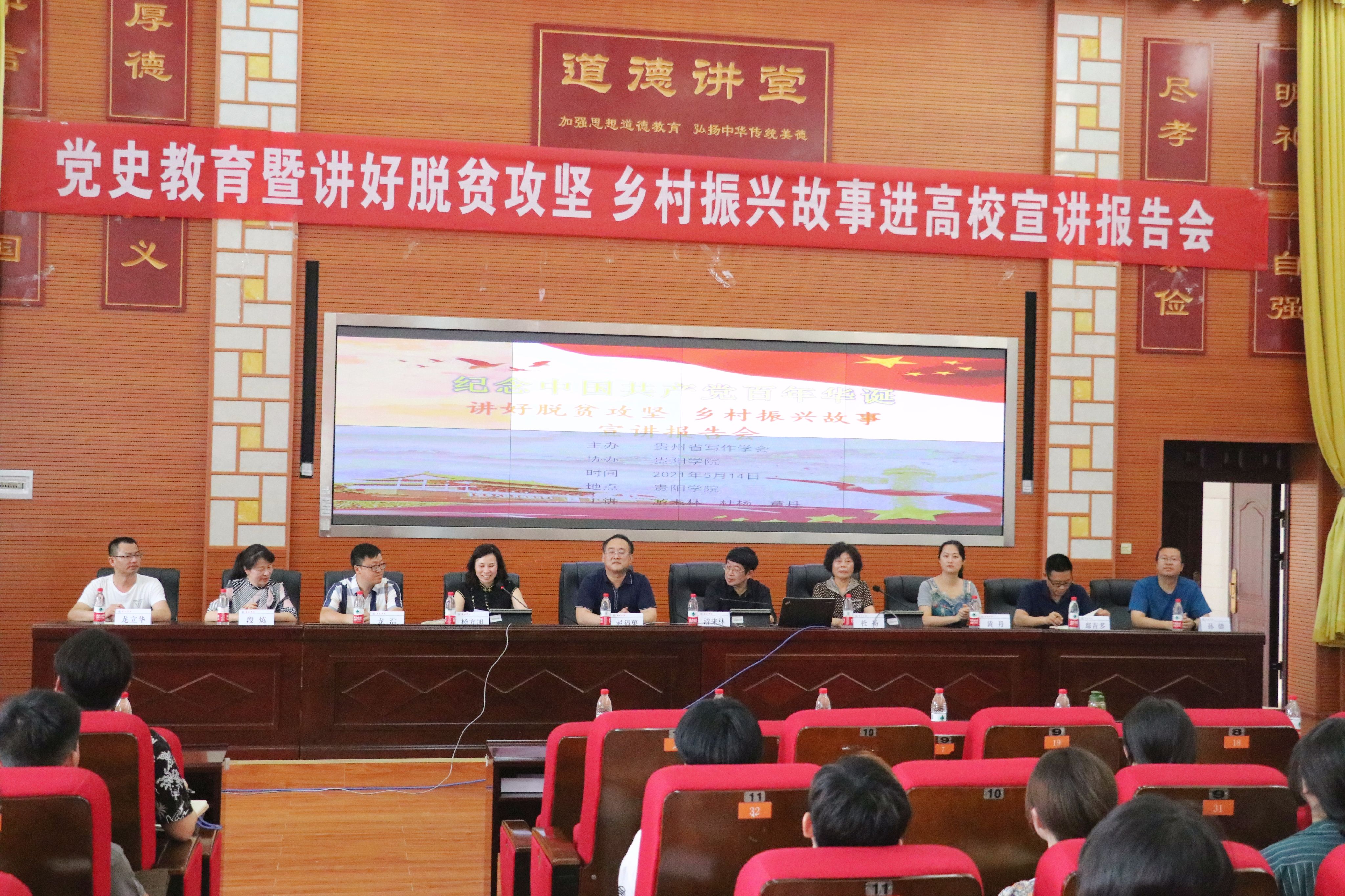 5月14日下午,贵阳学院党史教育暨“讲好脱贫攻坚乡村振兴故事”在我校博雅楼道德讲堂举行,来自贵州省写作学会的游来林、杜扬和黄丹教授受邀到我校为师生开展专题宣讲。贵阳学院党委副书记赵福菓出席宣讲会,宣传部长杨方旭、组织部副部长龙浩、宣传部副部长段炼、文化传媒学院党委副书记鄢吉多、外国语学院党委副书记龙立华、电子与通讯工程学院党委副书记孙健以及师生代表200余人参加宣讲会。宣讲会由杨方旭主持。