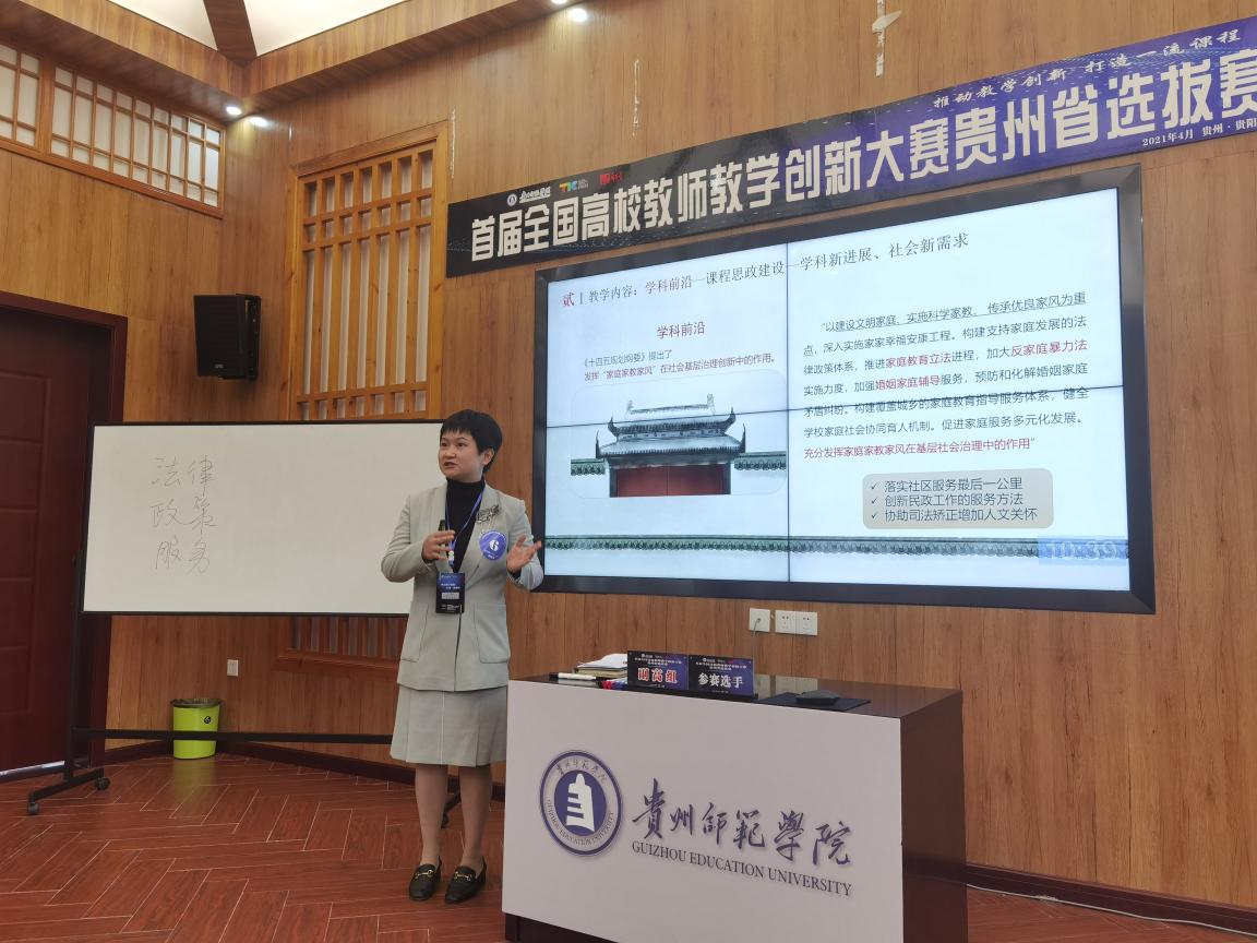 法学院《家庭社会工作》课程团队代表我校参加“首届全国高校教师教学创新大赛贵州赛区选拔赛”荣获二等奖。