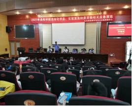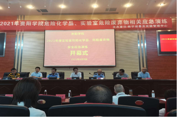 6月9日,贵阳学院教学设备及实验管理中心按照教育部对安全宣传教育的要求,属地公安机关对我校“易制毒”、“易制爆”管制类危险化学品的管理要求,结合学校自身情况组织开展2021年度实验室危险化学品、危险废弃物安全应急演练及培训会。培训会邀请贵阳市公安局双龙航空港经济区分局行政大队禁毒负责人蔡永祥警官、治安大队陈国志警官到校进行现场指导,贵阳学院李灿副校长,以及保卫、各化生类二级学院、教学设备及实验管理中心相关负责人以及师生代表260余名。会议由教学设备及实验管理中心副主任余磊主持。