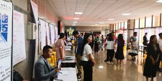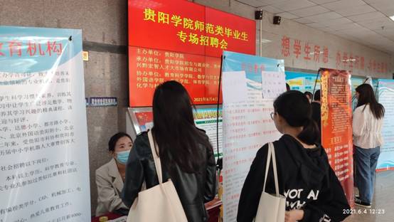 6月4日,在博雅楼一楼举办"贵阳学院师范类毕业生专场招聘会",邀请了33家教育类用人单位参会,提供1500余个就业机会。活动当天,到场参会师范类学生500余名,投递简历556份简历,初步达成意向130余名。