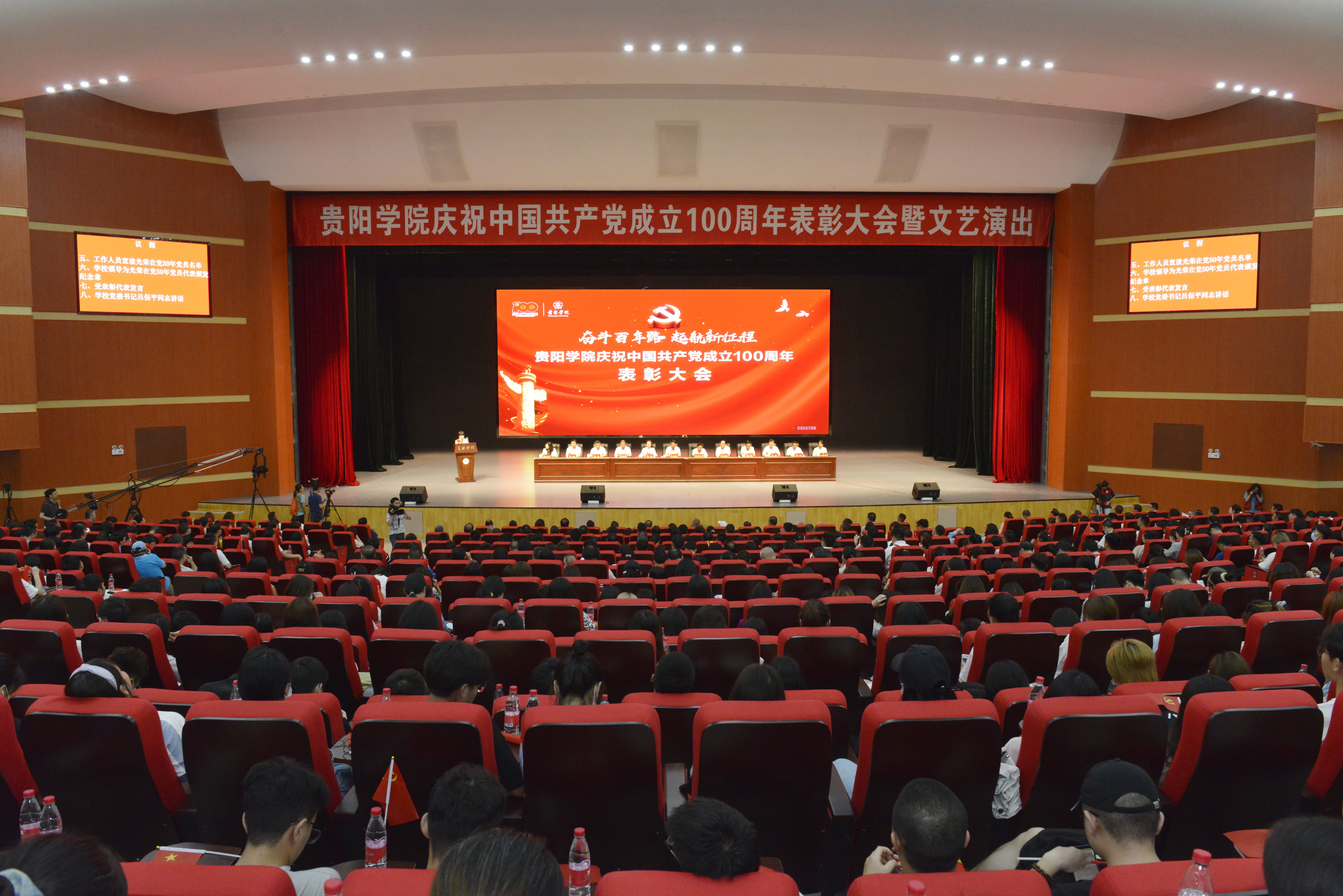 百年征程波澜壮阔,百年初心历久弥坚。6月28日,贵阳学院隆重举行庆祝中国共产党成立100周年表彰大会暨文艺演出,回顾党的光辉历程,讴歌党的丰功伟绩,表彰为学校发展作出贡献的优秀个人和先进集体,礼赞致敬“光荣在党50年”老党员同志。贵阳学院党委书记吕保平、校长向淑文,党委副书记焦艳、赵福菓,党委委员、副校长汪建初、韩勇、纪委书记马力,党委委员、副校长刘刚、李灿,党委委员、组织部部长周强、宣传部部长杨方旭、统战部部长许晓璐出席。各部门、教学院领导班子以及受表彰对象、党员代表、教师代表和学生代表共计1900人参加。省委党史学习教育第十七巡回指导组王高红莅临现场指导。