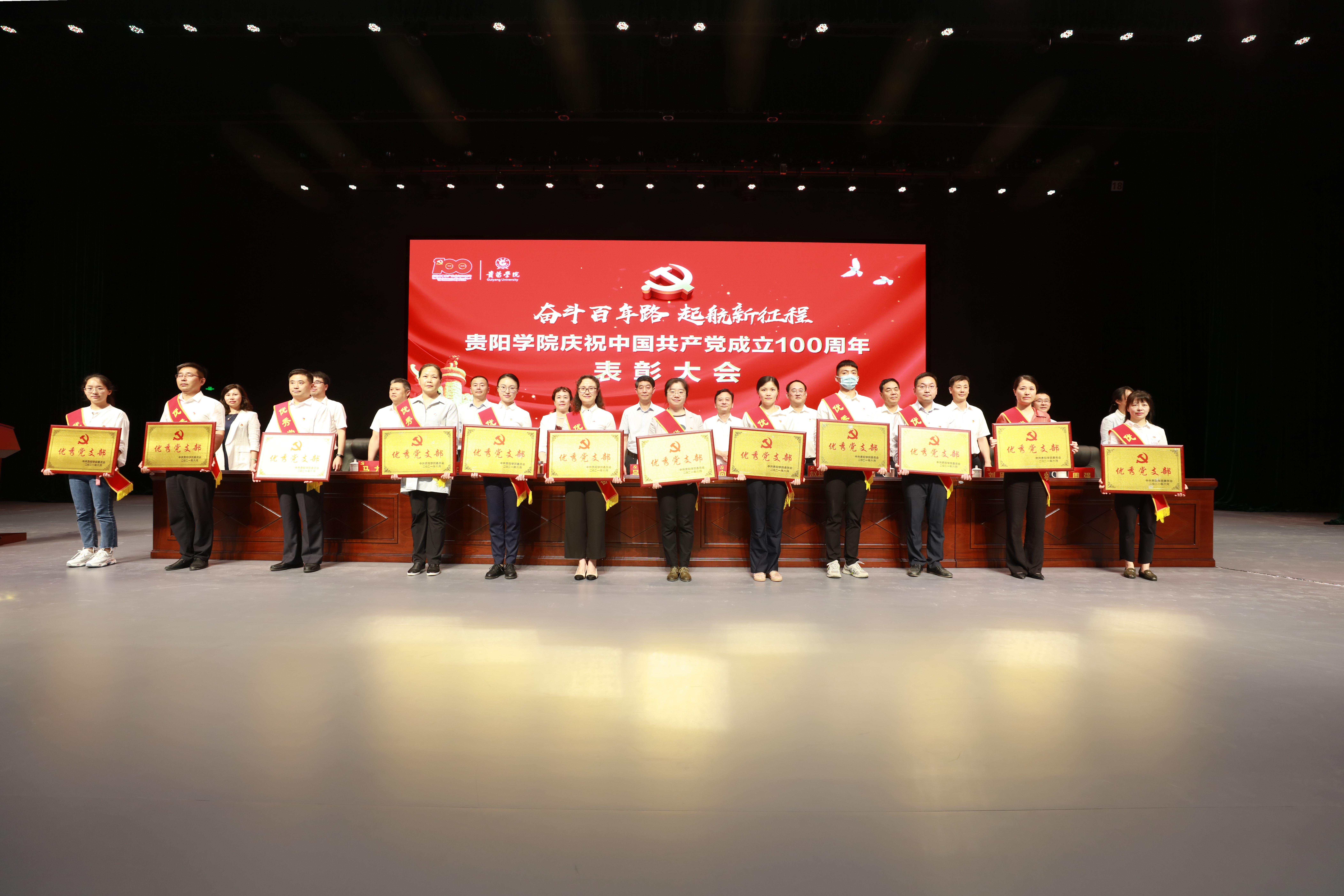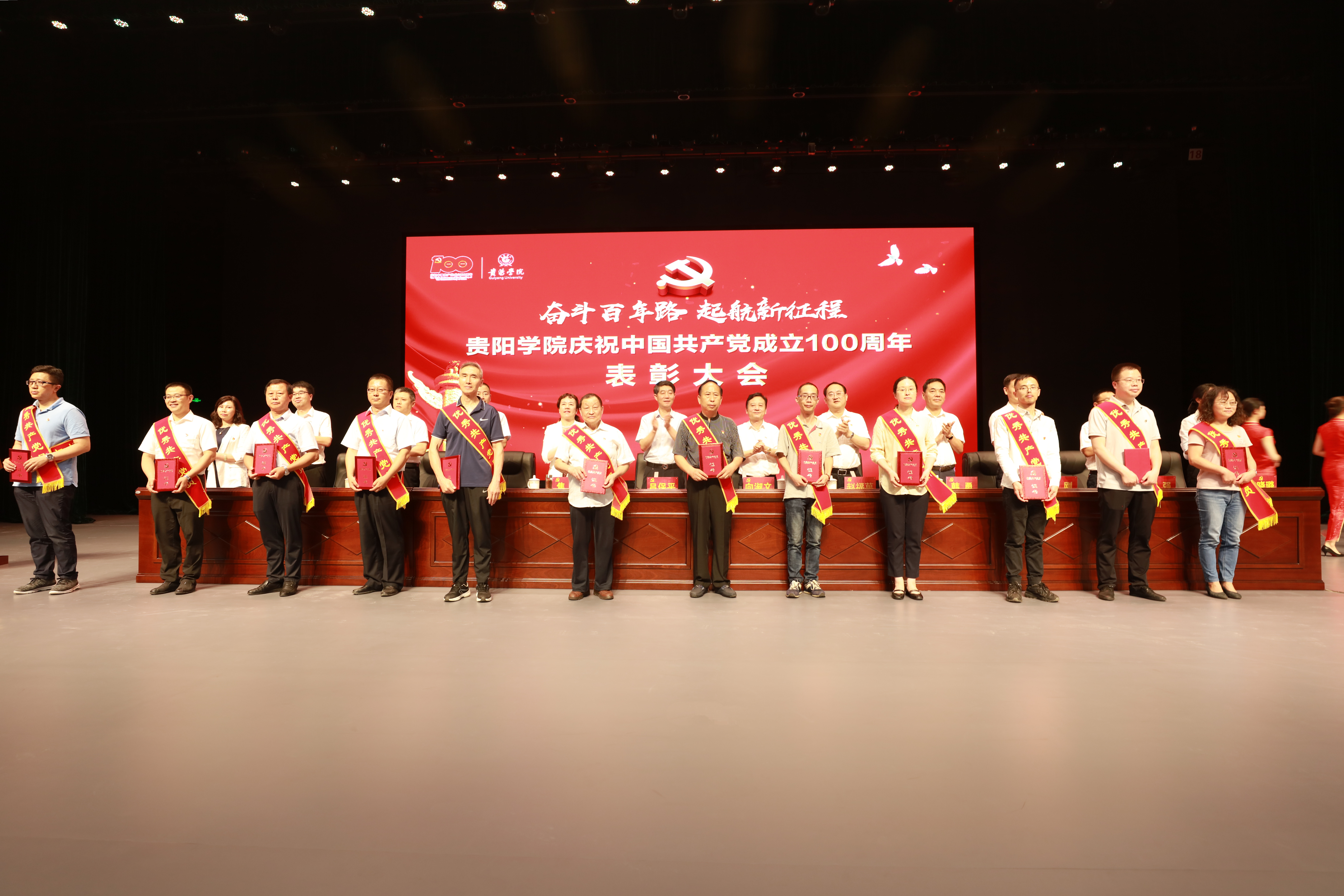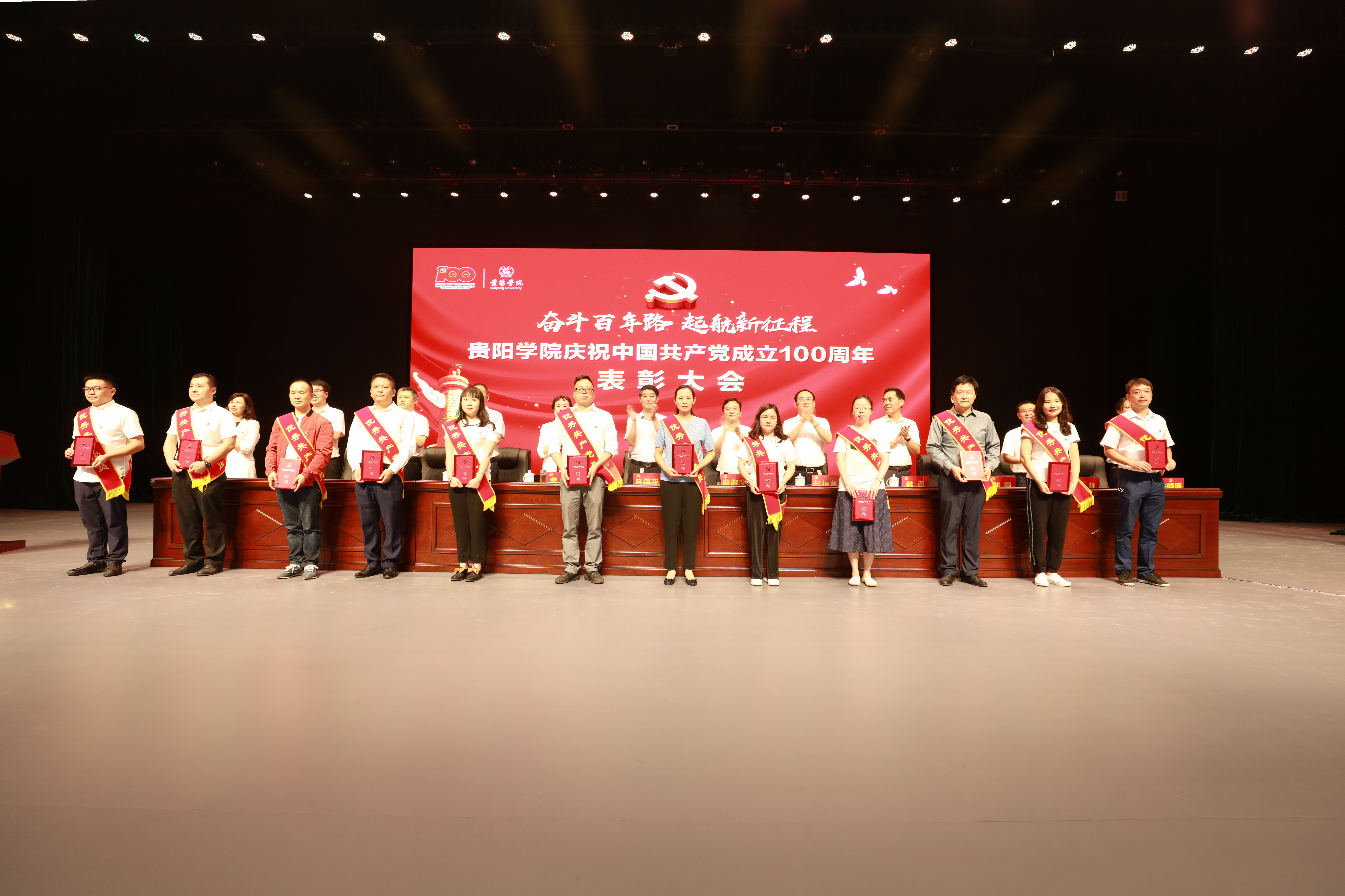 表彰大会在雄壮的国歌声中拉开序幕,贵阳学院对78名优秀共产党员、24名优秀党务工作者、20个优秀党支部、5个先进二级党委进行了表彰,并向24名党龄超50年的老党员颁发“光荣在党50年”纪念章。