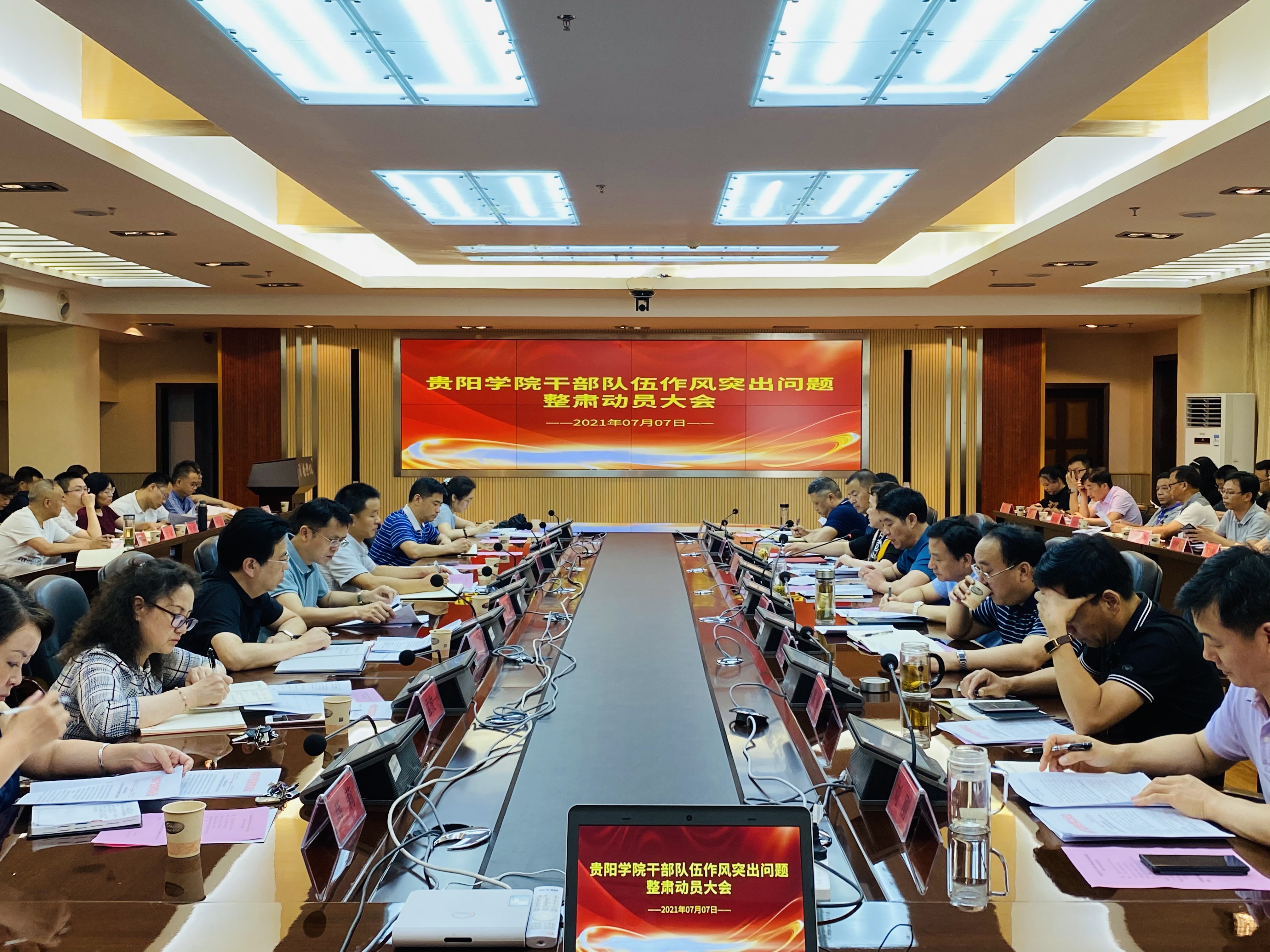 7月7日,贵阳学院在九思楼八楼会议室召开干部队伍作风突出问题整肃动员大会,深入学习贯彻习近平总书记视察贵州和在庆祝中国共产党成立100周年大会上的重要讲话精神,全面贯彻省委谌贻琴书记在贵州省庆祝中国共产党成立100周年大会上的讲话精神,贯彻落实贵阳贵安干部队伍作风突出问题整肃动员大会精神,深入分析当前我校干部队伍作风存在的突出问题,向学校各个领域的顽瘴痼疾和各级领导干部的不正之风“亮剑”,重拳整肃作风顽疾,为推进学校各项事业高质量发展提供坚强保障。
