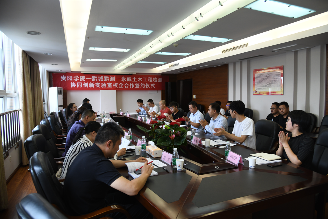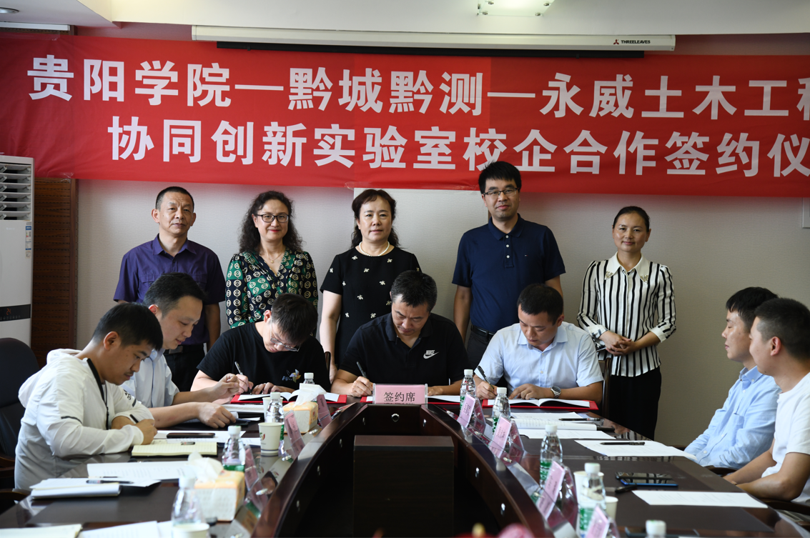 城乡规划与建筑工程学院刘军副院长、贵州黔城黔测检测技术有限公司廖贵龙总经理、贵州永威生物科技有限公司曾京城总经理作为校企双方代表签订协议。根据协议内容,企业方分批投资300万与贵阳学院共建协同创新实验室 ,实验室建成后将在土木工程数字化、智能化检测等领域进行技术创新,并开设“土木工程检测实验、实践”系列课程,共同培养优秀应用型人才;并可充分发挥校企双方的优势为社会创造价值。