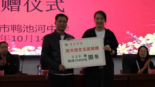 清镇市鸭池河中学校长吴学勇表示热烈的欢迎和由衷的感谢,勉励同学们从书本中汲取知识、开拓视野。徐晓凤介绍了贵阳学院及图书馆的相关情况,给同学们推荐了如《孙子兵法》、《海底两万里》、《中华上下五千年》等适合中学生阅读的图书,希望同学们能够通过阅读,增长知识及人生智慧。捐赠仪式上,学生代表还为党员代表佩戴了红领巾。