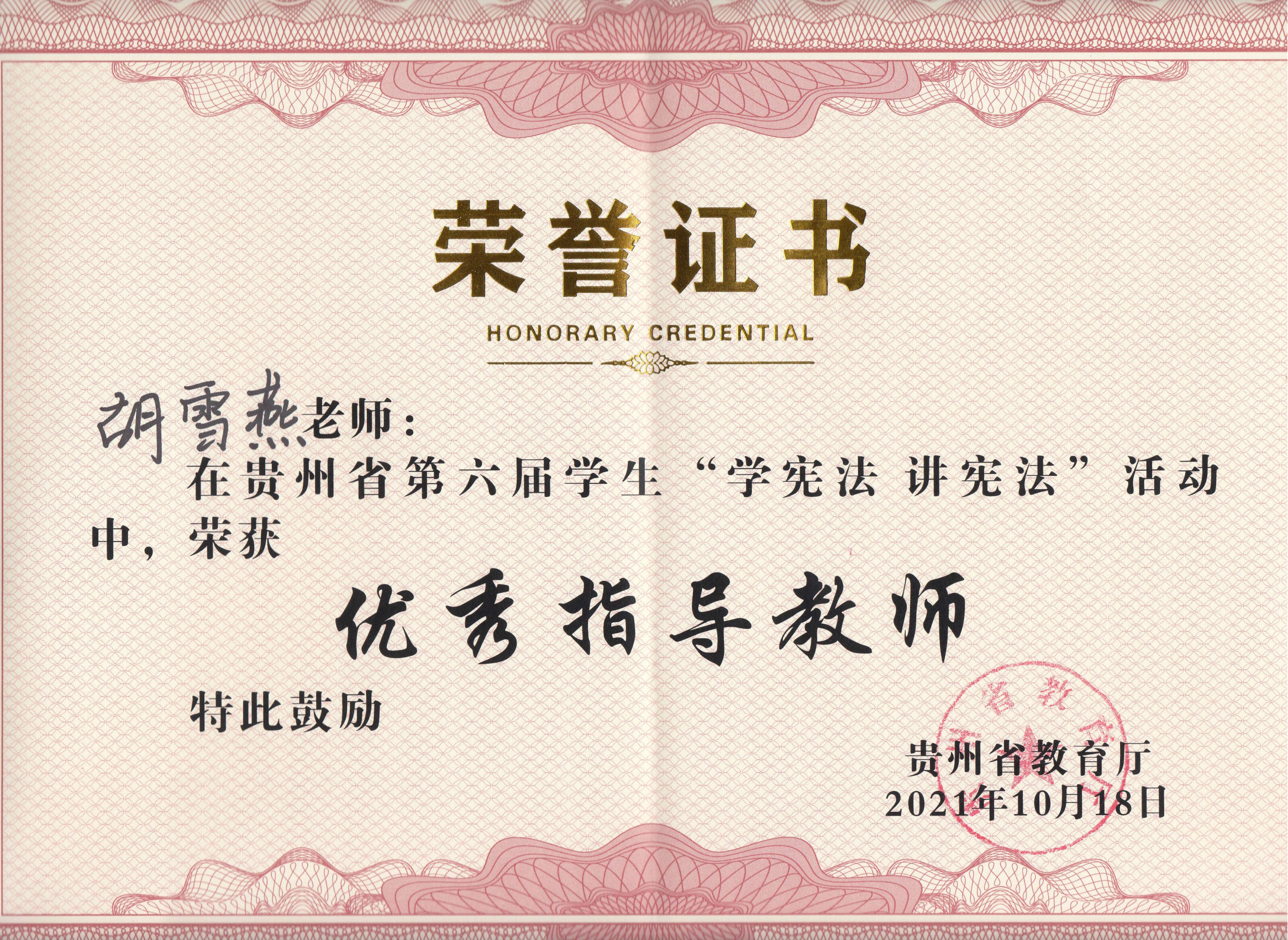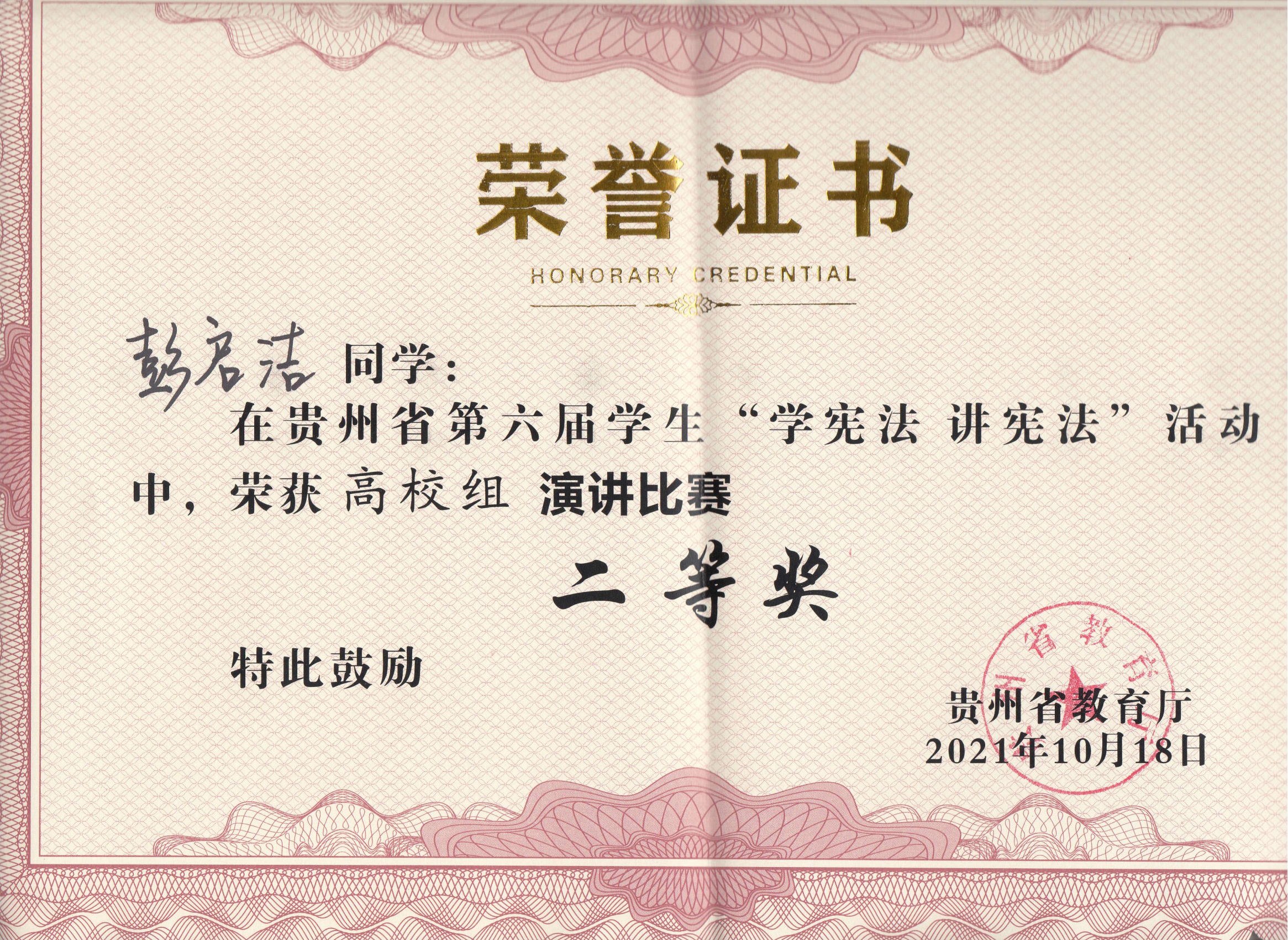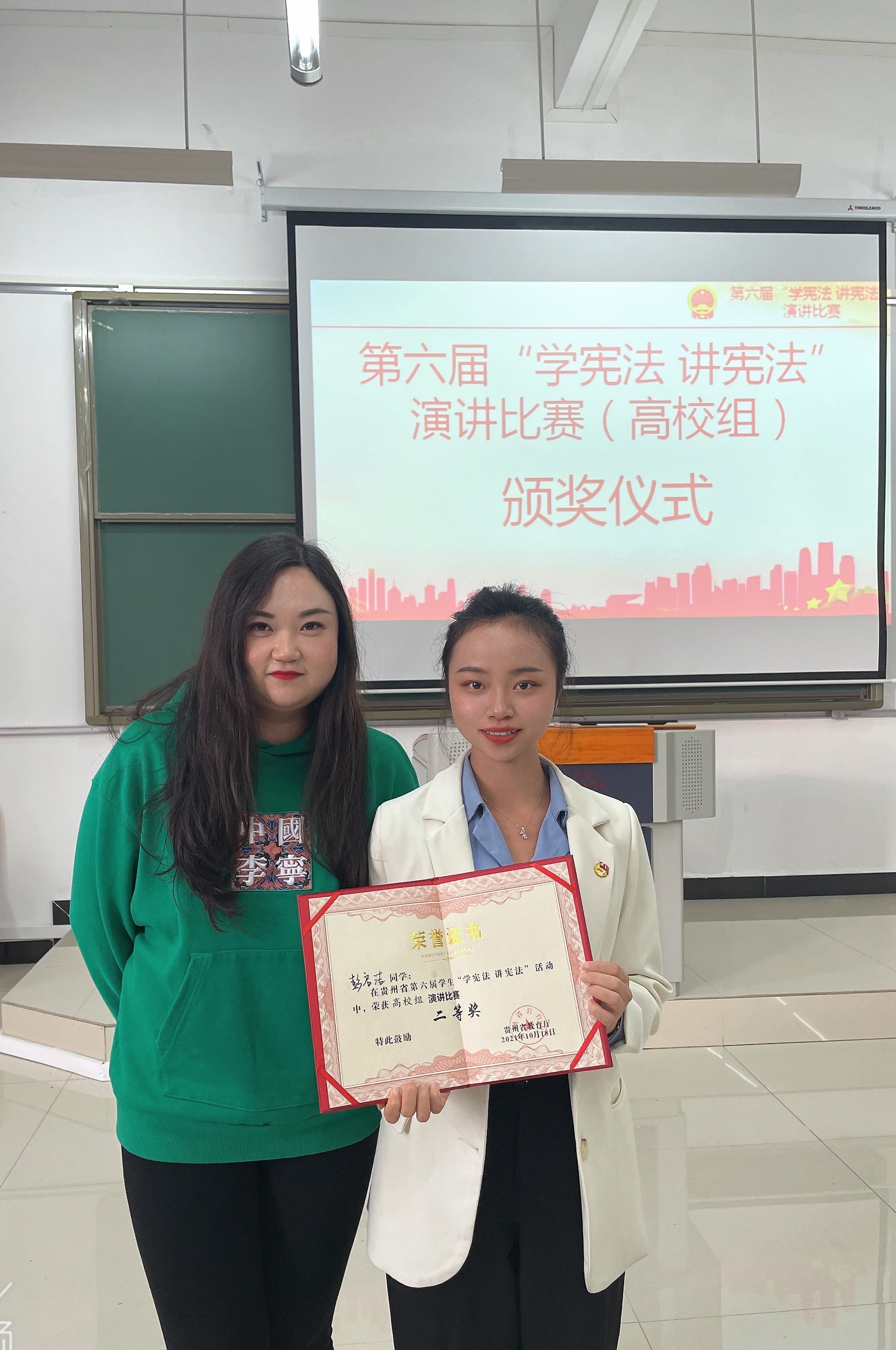 2021年10月18日,由贵州省教育工委,省教育厅主办,贵州民族大学承办的贵州省第六届学生“学宪法、 讲宪法”演讲比赛总决赛在贵州民族大学举行。贵阳学院19级汉语言文学1班彭启洁同学作为贵阳学院学生代表参赛,并获得高校组二等奖,我校林雨馨、胡雪燕获得优秀指导教师称号。