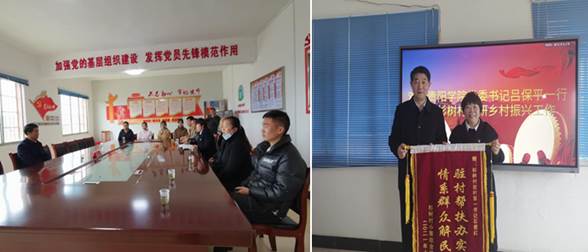 在村委会议室,吕保平代表学校向杉树村村支两委支持我校驻村干部顺利开展工作表示感谢,对学校派出的石登红老师和4名实习生为贵阳学院争得的荣誉表示祝贺,并听取了石登红驻村以来工作开展情况的汇报。他表示,石登红同志服从党委的安排到基层一线助力乡村振兴,尽心尽力为杉树村百姓做了很多实实在在的事情,得到村民的肯定,并收到村民们赠送的锦旗,一方面为学校争得荣誉,另一方面也体现了贵阳学院优秀青年干部的担当和作为。