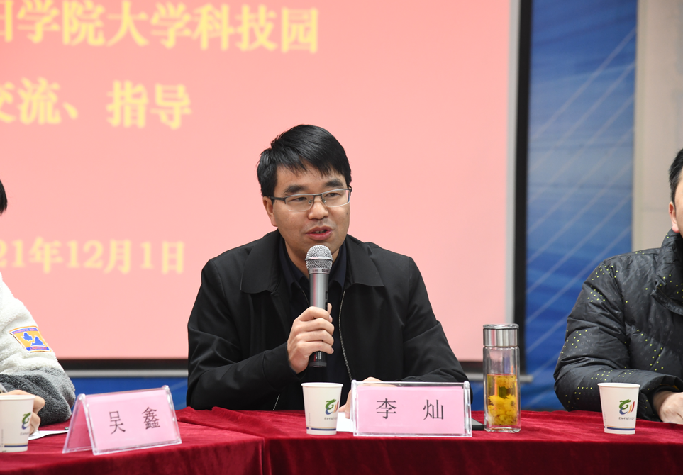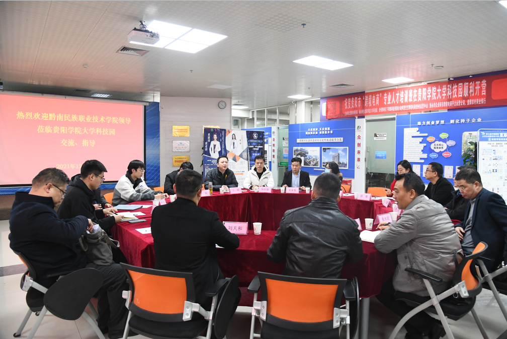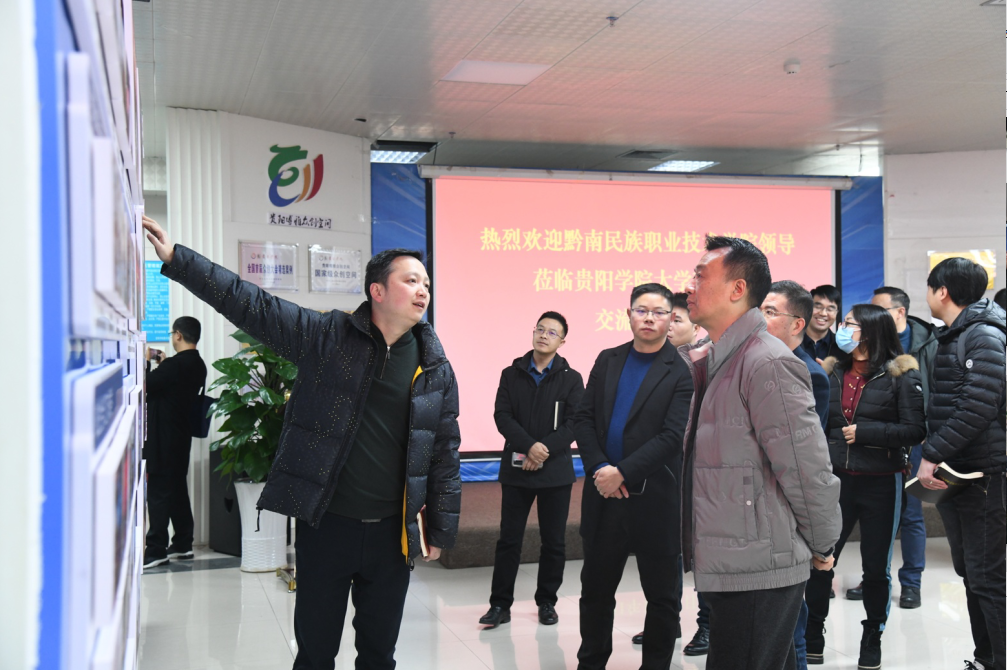 2021年12月1日,黔南民族职业技术学院党委委员、副院长张金华及学院教务处、科研处及部分系部负责人一行10人赴贵阳学院博雅众创空间,就高校大学生创新创业、人才培养建设和众创空间建设工作进行调研。贵阳学院副校长李灿、大学科技园管理中心主任王瑞等相关负责人参与本次调研活动。
