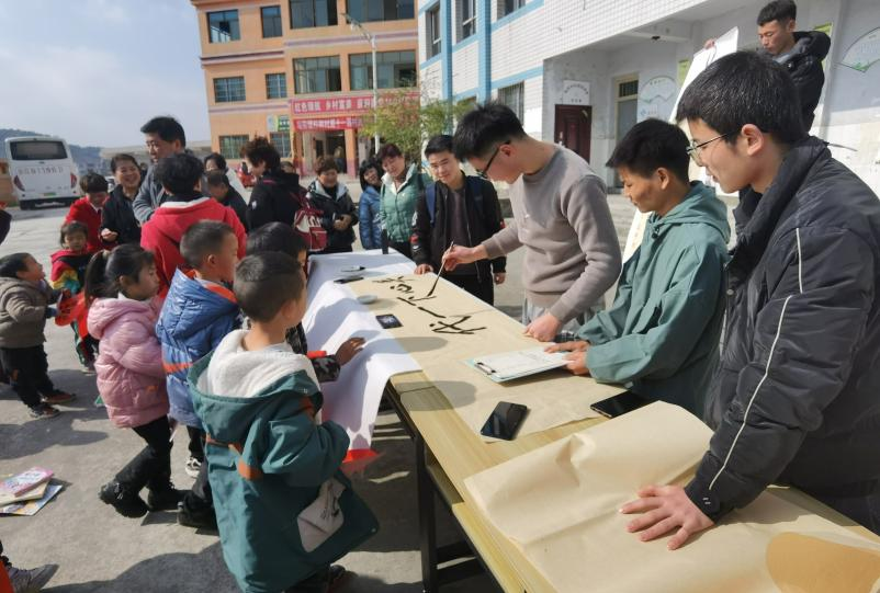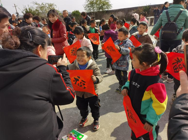 在杉树村小学,我校关工委和离退休处党委向杉树村小学捐赠了图书,启弘印社的同学们现场挥毫,向每一位参加活动的小学生赠送书写的"福"字。文化下乡送福上门,增添了校园年关喜庆祥和的气氛。