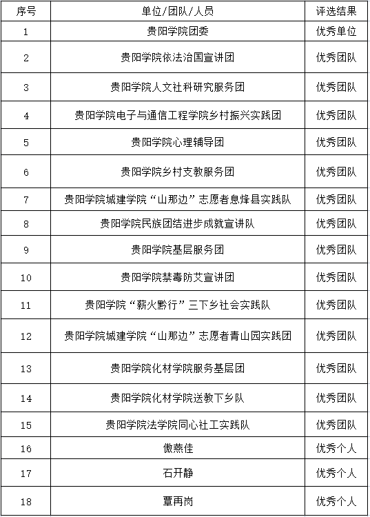 近日,根据省委宣传部、省精神文明办、省教育厅、团省委、省学联下发的《关于公布2021年贵州省大中专学生志愿者暑期文化科技卫生“三下乡”社会实践活动的省级评选结果的通报》,贵阳学院团委获评2021年贵州省“三下乡”社会实践活动“优秀单位”,“贵阳学院依法治国宣讲团”等14支团队获评2021年贵州省“三下乡”社会实践活动“优秀团队”,我校傲燕佳等3名同学获评2021年贵州省“三下乡”社会实践活动“优秀个人”。