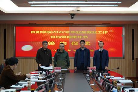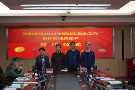 会上,刘刚传达了中央、省、市就业工作会议精神。考核办主任曾旭葵对就业专项工作实行“一票否决”进行政策解读说明。食品与制药工程学院党委书记谢玲和生物与环境工程学院党委书记唐运前代表专业学院做交流发言。会上,校党委书记和校长分别与各专业学院党委书记、院长签订《贵阳学院2022年毕业生就业工作目标管理责任书》。