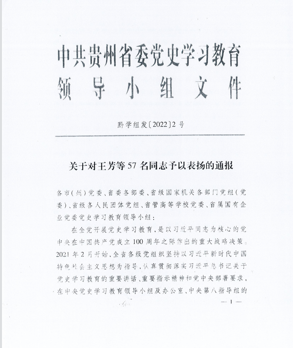 近日,接中共贵州省委党史学习教育领导小组文件《省委党史学习教育领导小组对在党史学习教育工作中表现突出的王芳等57名同志予以通报表扬》,我校退休老同志、原党委副书记张年举获通报表扬。