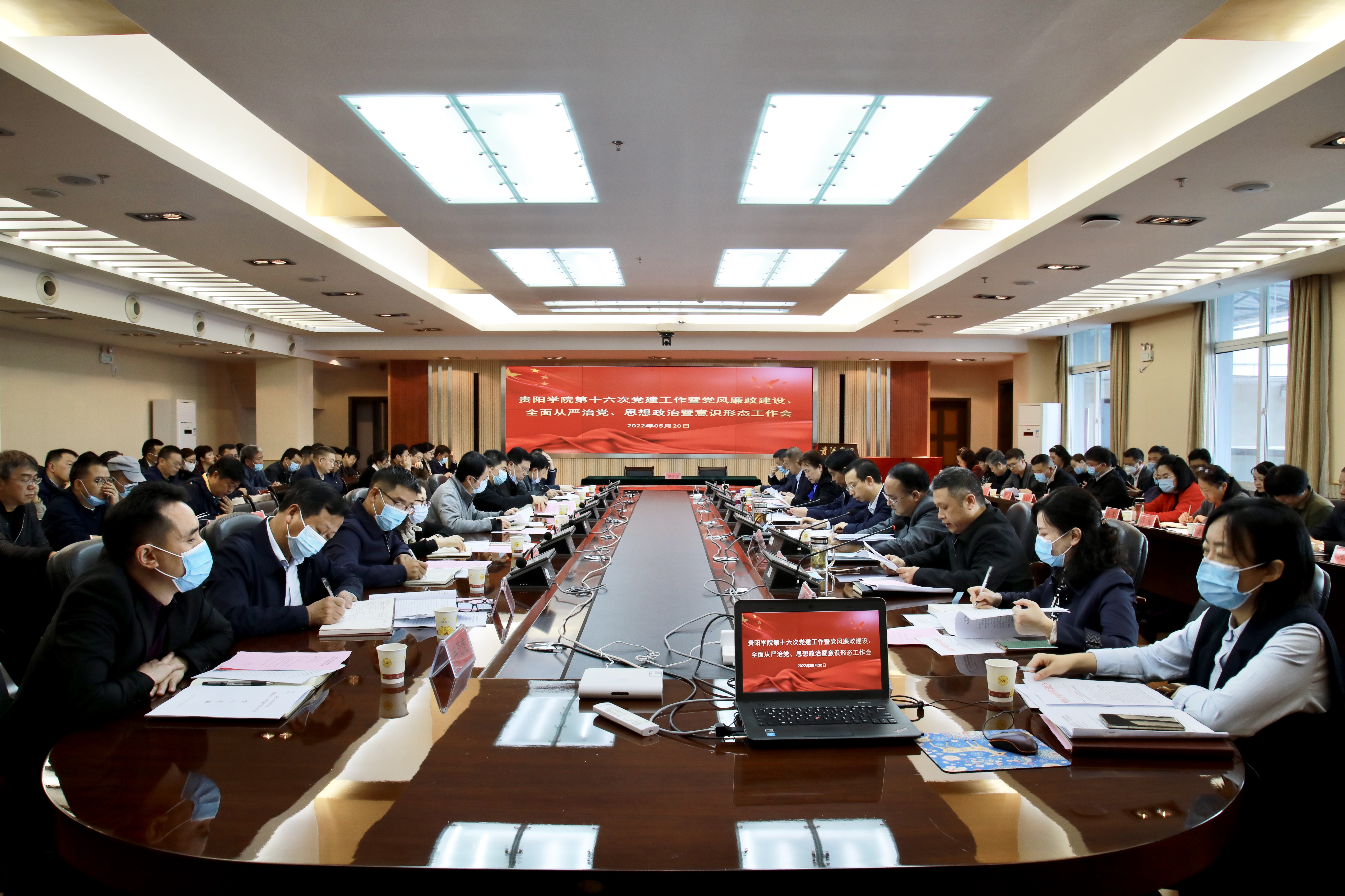 2022年5月20日上午,贵阳学院第十六次党建工作暨党风廉政建设、全面从严治党、思想政治暨意识形态工作会议在我校九思楼八楼会议室召开。校党委书记吕保平,党委副书记、校长邓朝勇,党委副书记焦艳、赵福菓,副校长汪建初,纪委书记马力出席会议。全校副处级以上干部参加会议。会议由邓朝勇主持。