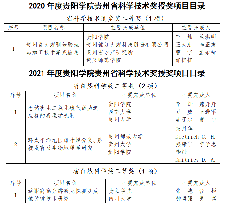 我校李灿教授主持完成的“贵州省大鲵驯养繁殖与加工技术集成应用”获2020年度省科学技术进步奖二等奖。我校李灿教授主持/参与完成的“仓储害虫二氧化碳气调胁迫应答的毒理学机制”和“环太平洋地区斑叶蝉分类、系统发育及生物地理学研究”获2021年度省自然科学奖二等奖。我校张艳教授主持完成的“远距离高分辨激光探测及成像关键技术研究”获2021年度省自然科学奖三等奖。