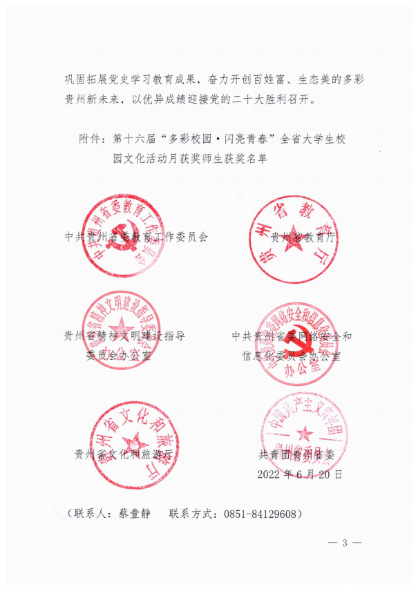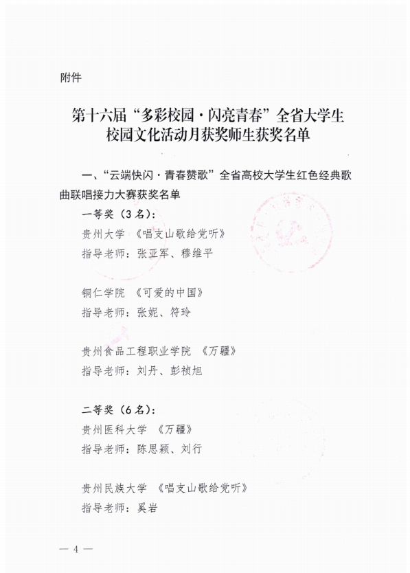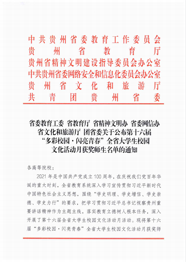 近日,接《省委教育工委 省教育厅 省精神文明办 省委网信办 省文化和旅游厅 团省委关于公布第十六届“多彩校园·闪亮青春”全省大学生校园文化活动月获奖师生名单的通知》,我校教师彭麟、蒲紫嫣指导的歌曲联唱《灯火里的中国》荣获二等奖。