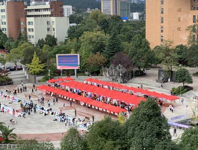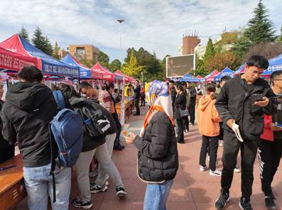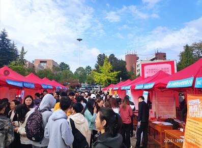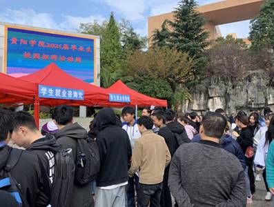 10月21日第一场毕业生校园招聘会,活动吸引了众多用人单位到场参与,包括:贵阳南明老干妈风味食品有限责任公司、百胜餐饮(成都)有限公司贵州分公司、中开建工集团有限公司、贵阳苏宁易购销售有限公司、贵州德坤大数据(集团)有限公司、贵州深高速置地有限公司、贵州国美电器有限公司、浙江英特来光电科技有限公司等100家单位,提供5000余个就业机会。当天,共有2500余名学生入场参会,收到投递简历2000余份,初步达成就业意向1112余人。10月23日第二场毕业生校园招聘会,入场单位83家,提供2113个岗位,现场报名900人次,达成初步就业意向331人。每场招聘会,毕业生根据个人情况在现场与各个企业进行咨询交谈。现场秩序井然,人头攒动,每家企业前都挤满了咨询的学生,热闹的氛围还吸引了很多非毕业班的学生前来驻足聆听,提前了解企业招聘流程及要求。