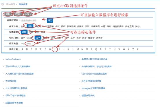 随着图书馆数字资源数量不断增加,为了让广大师生能够快捷、高效地使用图书馆的数字资源,图书馆对数字资源网页界面及功能作了相应的升级调整。升级以后读者可根据自己的需求,按内容分类、采购类型、学科门类、语言类型、字母分类等筛选条件快速找到自己所需的数据库。调整后界面如下图: