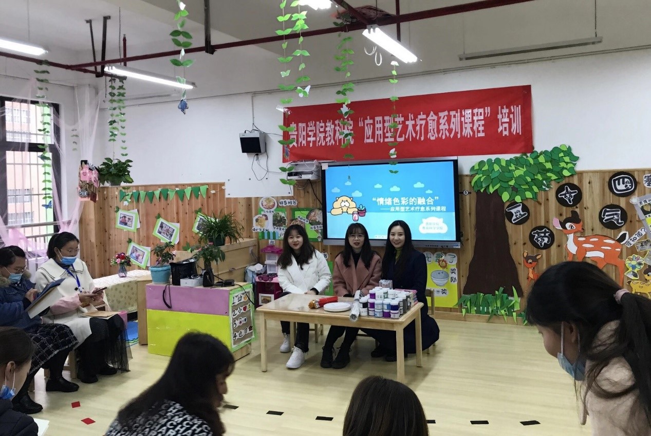 2020年11月26日中午,贵阳学院颜媛、刘蕾、彭麟等三位老师前往开阳县蒋家寨幼儿园开展“应用型艺术疗愈系列课程”培训,参会的有幼儿园园长熊汝梅、挂职副园长袁媛、幼儿园全体幼教老师以及10名贵阳学院学前教育专业的实习学生。